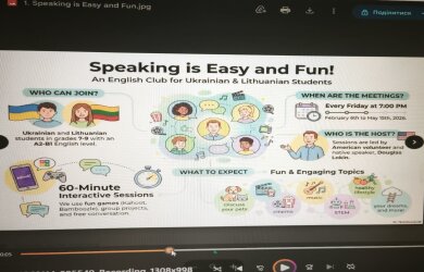Pokalbių klubas „Speaking is easy and fun!“ bus skirtas mokiniams ir mokytojams anglų kalbos įgūdžiams gerinti. Planuojami pokalbiai porose apie kiną, muziką, keliones, sveiką gyvenseną, svajones, interaktyvūs grupiniai užsiėmimai.