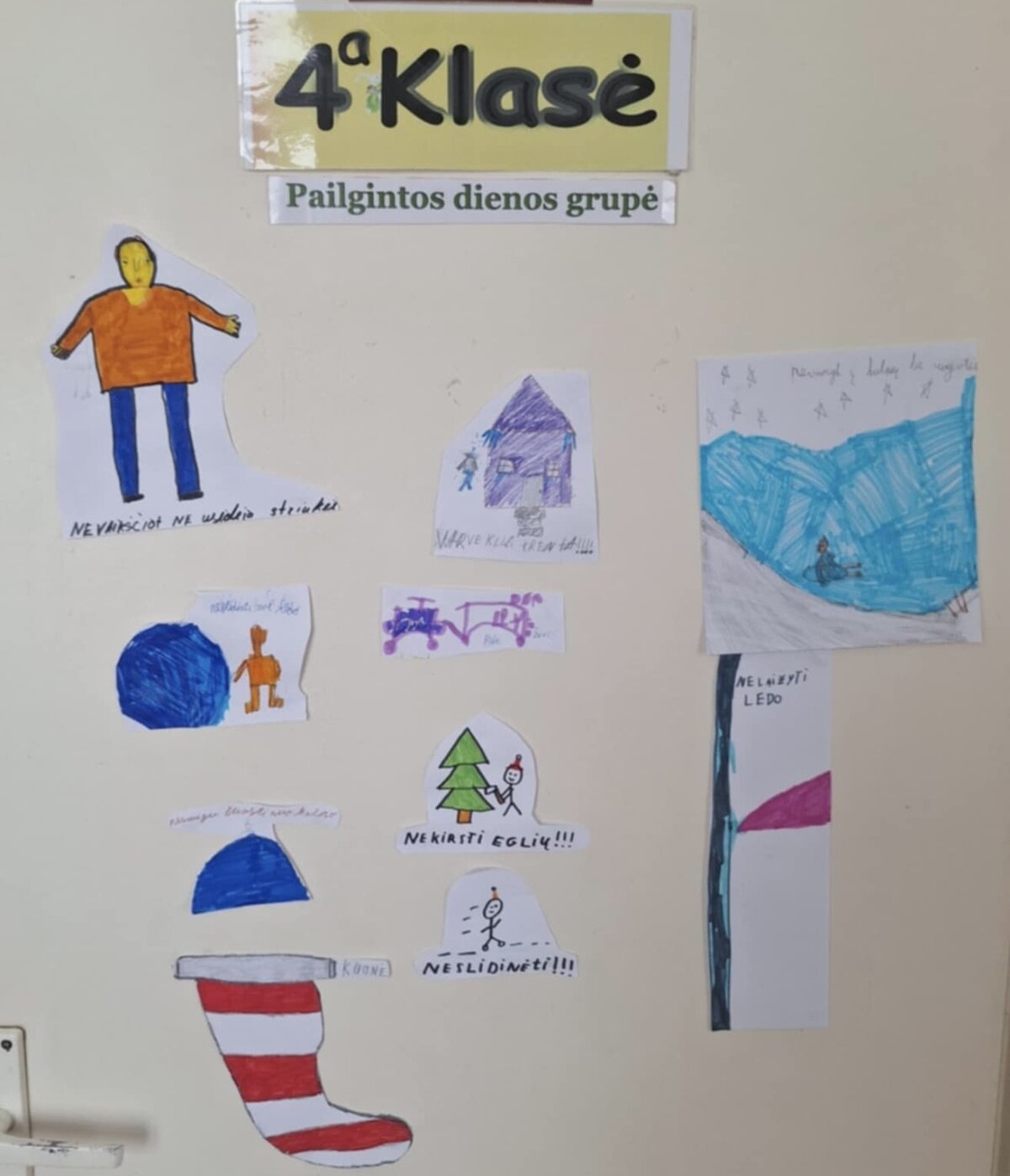 Mokiniai dalyvavo klausimų žaidime naudodami žalias ir raudonas korteles- puikiai atsakė į klausimus ir pagilino savo žinias. Kūrybinės užduoties metu vaikai piešė jiems labiausiai patikusį žiemos objektą ar situacija, susijusia su saugumu žiemą.
