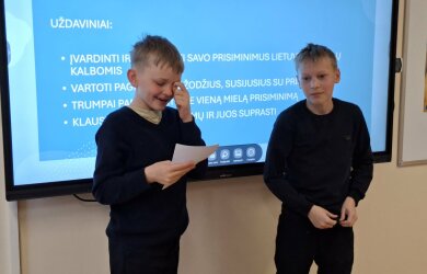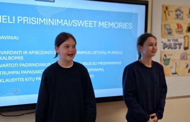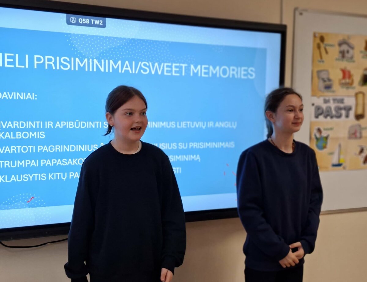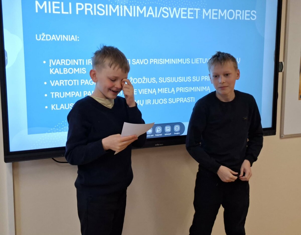 lietuvių ir anglų kalbų pamokoje tema „Šilti prisiminimai / Sweet Memories“, kurią vedė mokytojos Romalda ir Reda. Dirbdami porose mokiniai kūrė ir dalijosi savo įsimintiniausiais vaikystės prisiminimais, naudodami pateiktus anglų kalbos žodžius, atliko užduotis raštu. Mokiniai ne tik lavino anglų kalbos žodyną, bet ir mokėsi pasakoti, klausytis vieni kitų bei drąsiai pristatyti savo istorijas klasės draugams. Pamoka buvo kupina šypsenų, jaukių emocijų ir gražių prisiminimų.