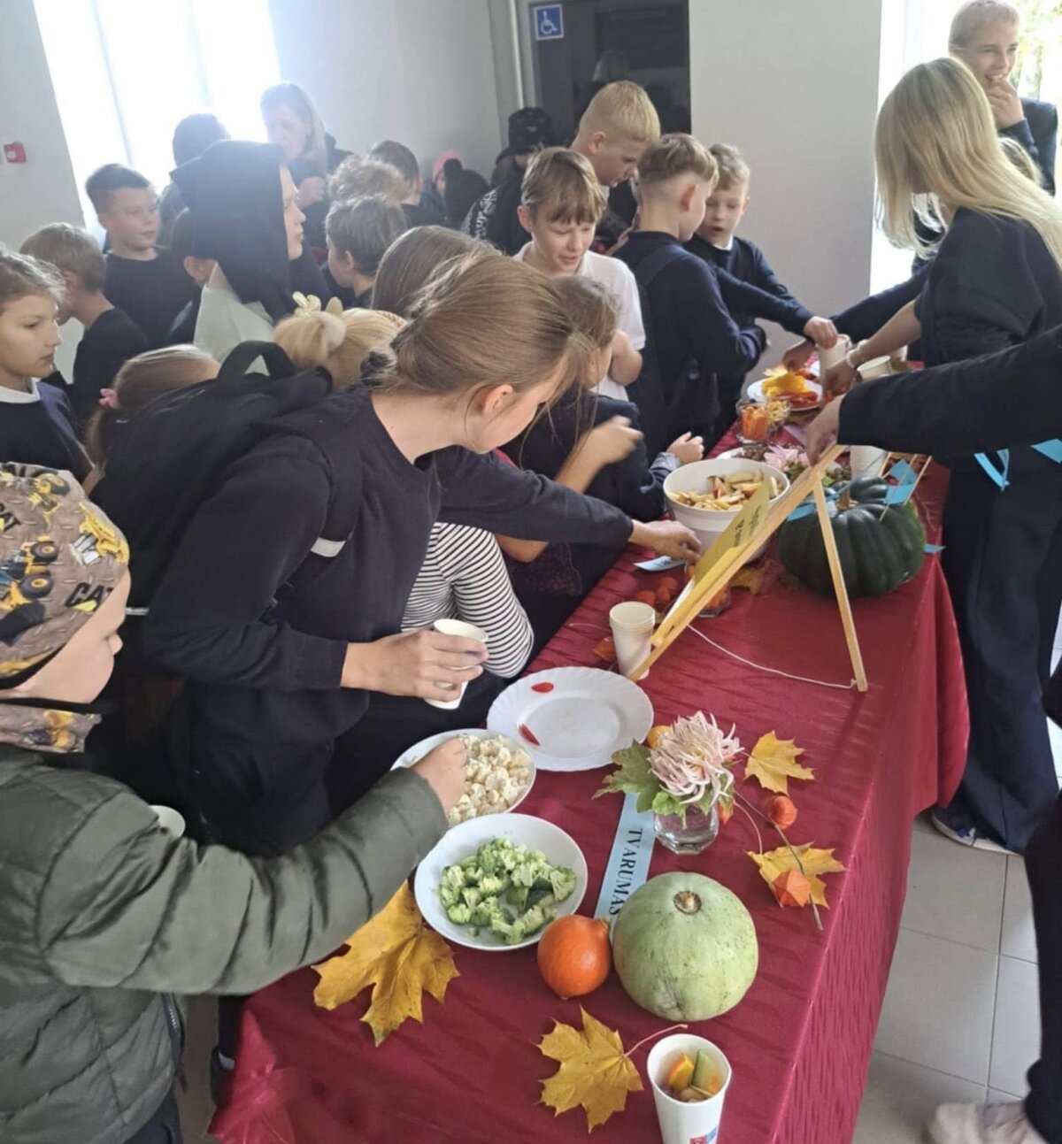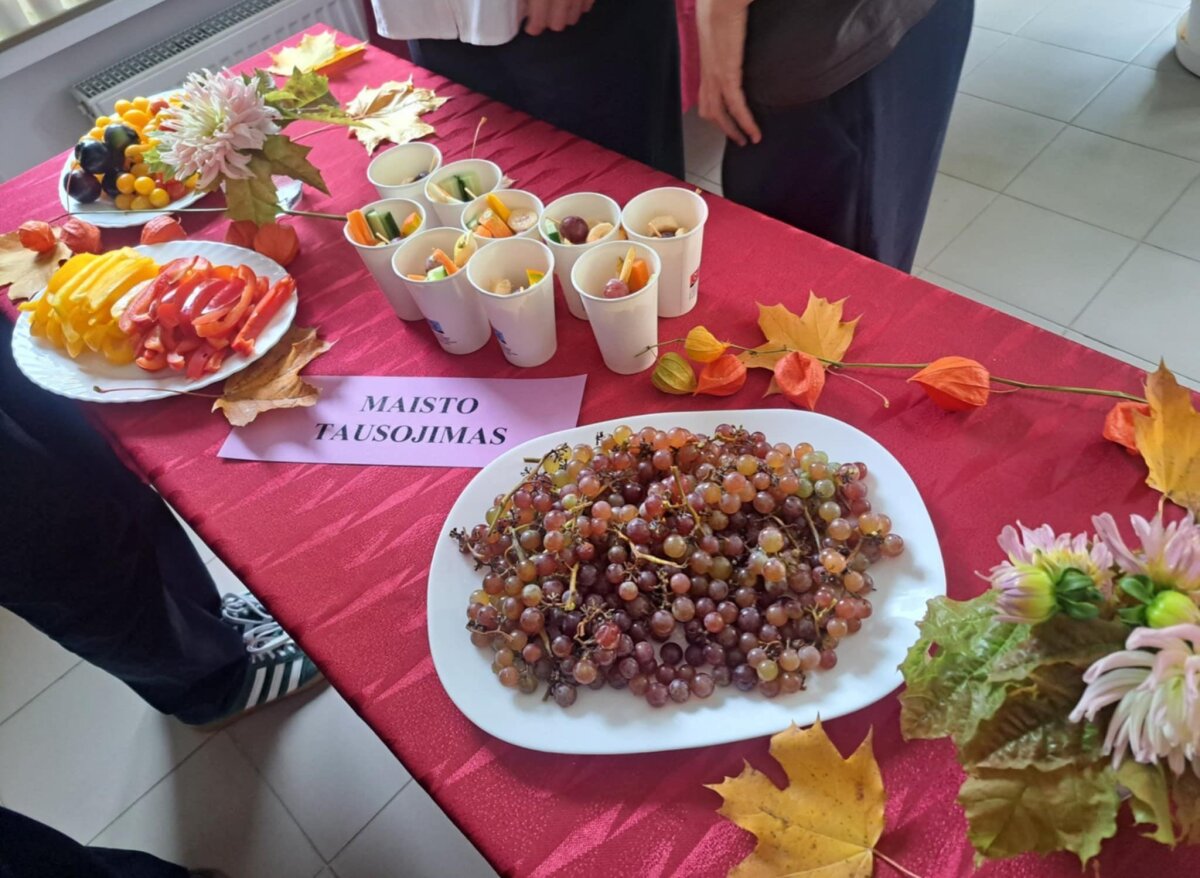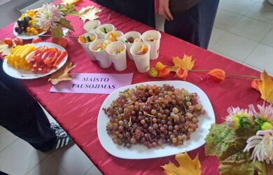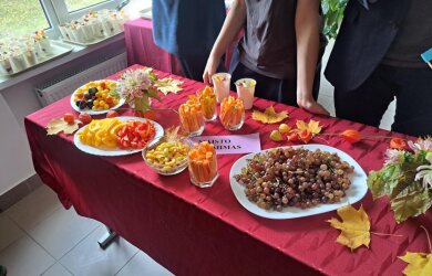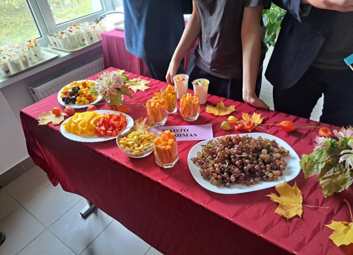 Ta proga gimnazijos II aukšto foje buvo paruoštas sveikų užkandžių stalas. Sveikais užkandžiais galėjo pasivaišinti visi norintys. Buvo kreiptas dėmesys į sveiką mitybą, maisto tausojimą ir tvarumą. Dėkojame 3G klasės moksleiviams Santai, Viktorijai, Austėjai, Gabijai ir Vaidui, kurie padėjo paruošti sveikas vaišes. Vaišės buvo surengtos projekto ,,Sveikesnės mitybos link” lėšomis, kurį finansuoja VĮ „Humana People to People Baltic“. Ačiū projekto rėmėjams. Taip pat ačiū biologijos mokytojai Giedrei už morkas ir obuolius, ačiū mokinio padėjėjai Danutei už moliūgus.