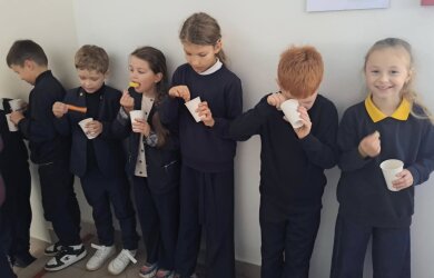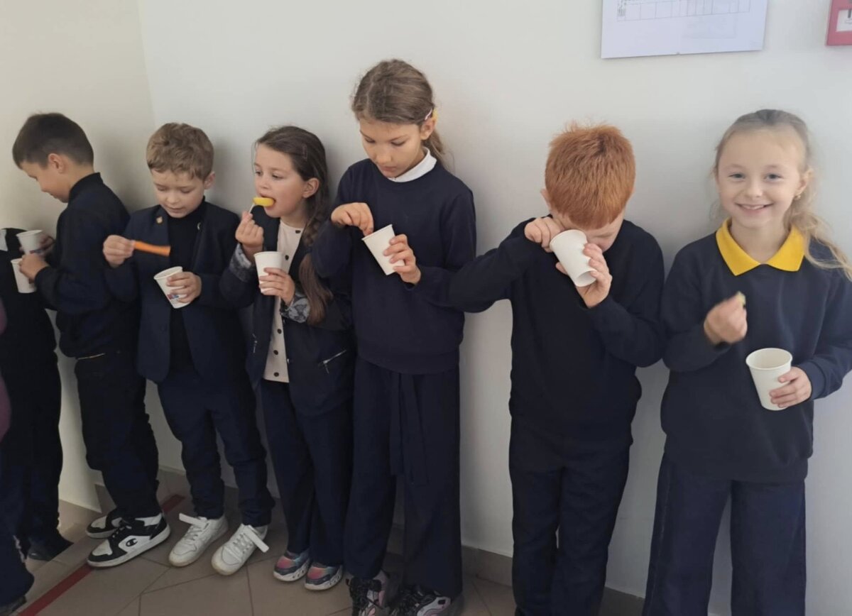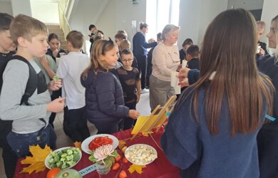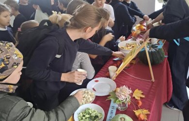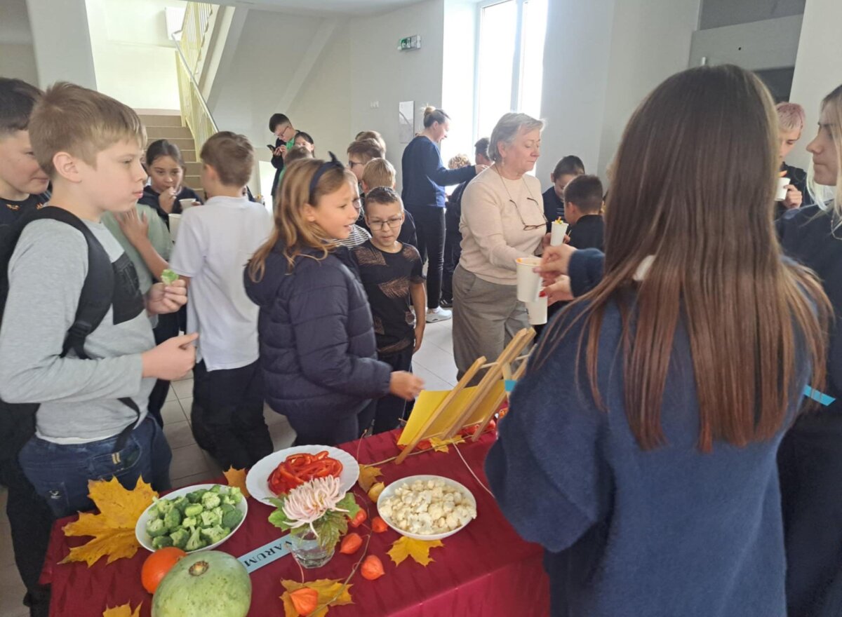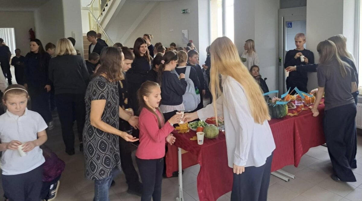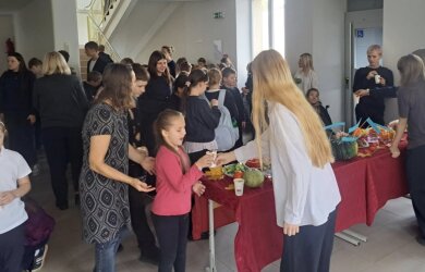 Ta proga gimnazijos II aukšto foje buvo paruoštas sveikų užkandžių stalas. Sveikais užkandžiais galėjo pasivaišinti visi norintys. Buvo kreiptas dėmesys į sveiką mitybą, maisto tausojimą ir tvarumą. Dėkojame 3G klasės moksleiviams Santai, Viktorijai, Austėjai, Gabijai ir Vaidui, kurie padėjo paruošti sveikas vaišes. Vaišės buvo surengtos projekto ,,Sveikesnės mitybos link” lėšomis, kurį finansuoja VĮ „Humana People to People Baltic“. Ačiū projekto rėmėjams. Taip pat ačiū biologijos mokytojai Giedrei už morkas ir obuolius, ačiū mokinio padėjėjai Danutei už moliūgus.