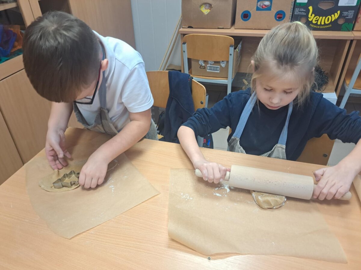 Trečiokai ir pirmokai turėjo atlikti kūrybinę užduotį – mokiniai gavo šimtą gramų meduolių tešlos ir kūrė savo meduolius – kas patys formavo, kas naudojo formeles.