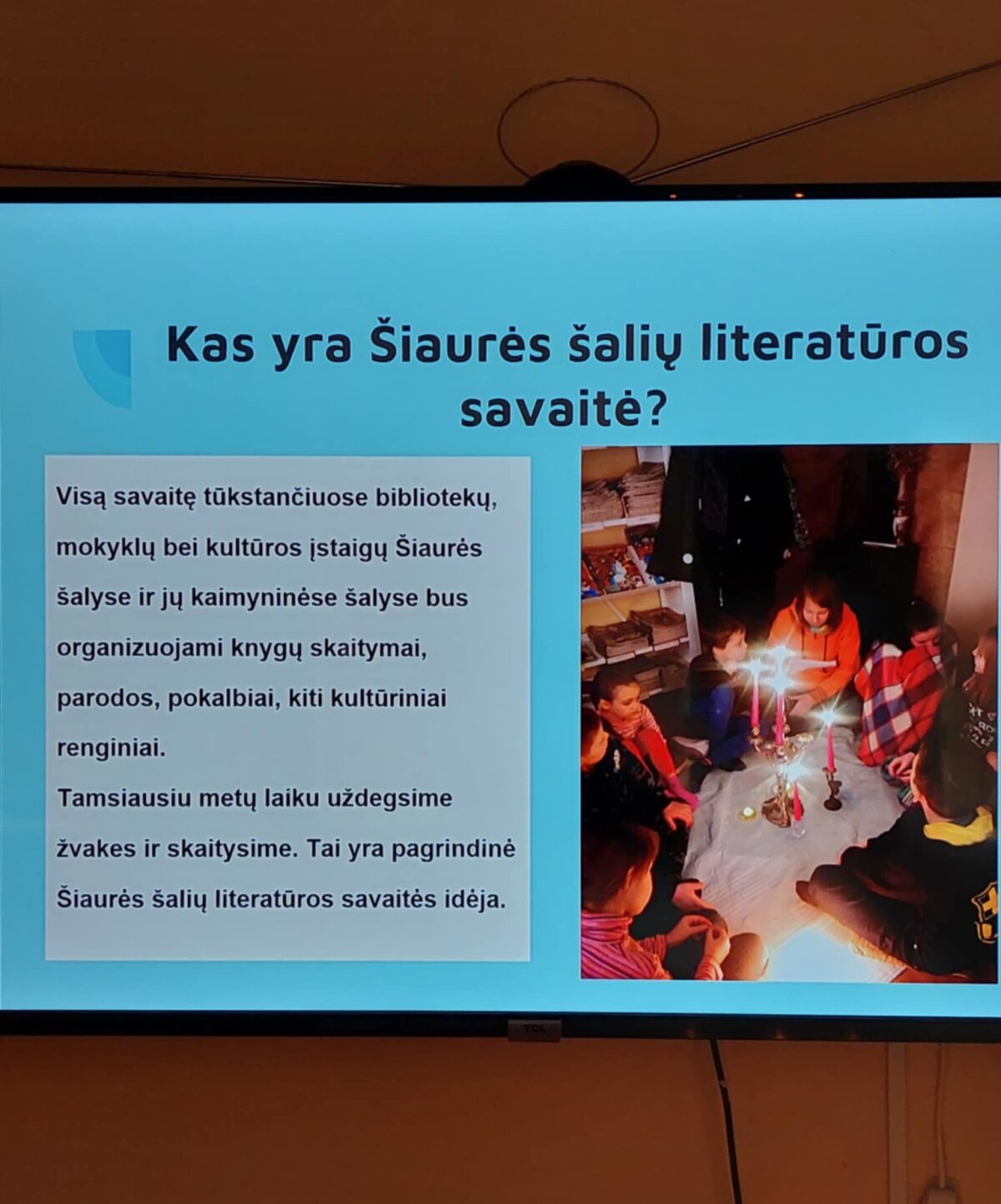 Todėl mūsų gimnazijos 3a ir 3b klasių mokinius Kėdainių M. Daukšos bibliotekos Josvainių skyriaus bibliotekininkė Kristina Masiliūnienė pakvietė į jaukią popietę „Poilsis su knyga žvakių apsuptyje“. Jos metu vaikai apžiūrėjo Šiaurės šalių rašytojų vaikiškų knygų parodą ir atliko įdomias užduotis. Stebėdami vaizdo medžiagą apie Švediją, Norvegiją, Daniją, Suomiją ir Islandiją susipažino su nuostabia šių šalių gamta. Tada žvakių šviesoje perskaitė „slaptą raštą“, kuriame rado užduotį. Bibliotekoje trečiokai greitai surado didžiulį senovinį lagaminą, bet sugaišo nemažai laiko, kol pavyko jį be rakto atrakinti. Lagamine buvo staigmena – šiaurietiškos vaišės.