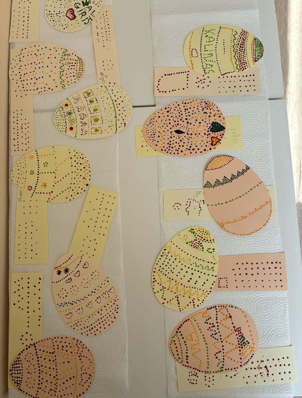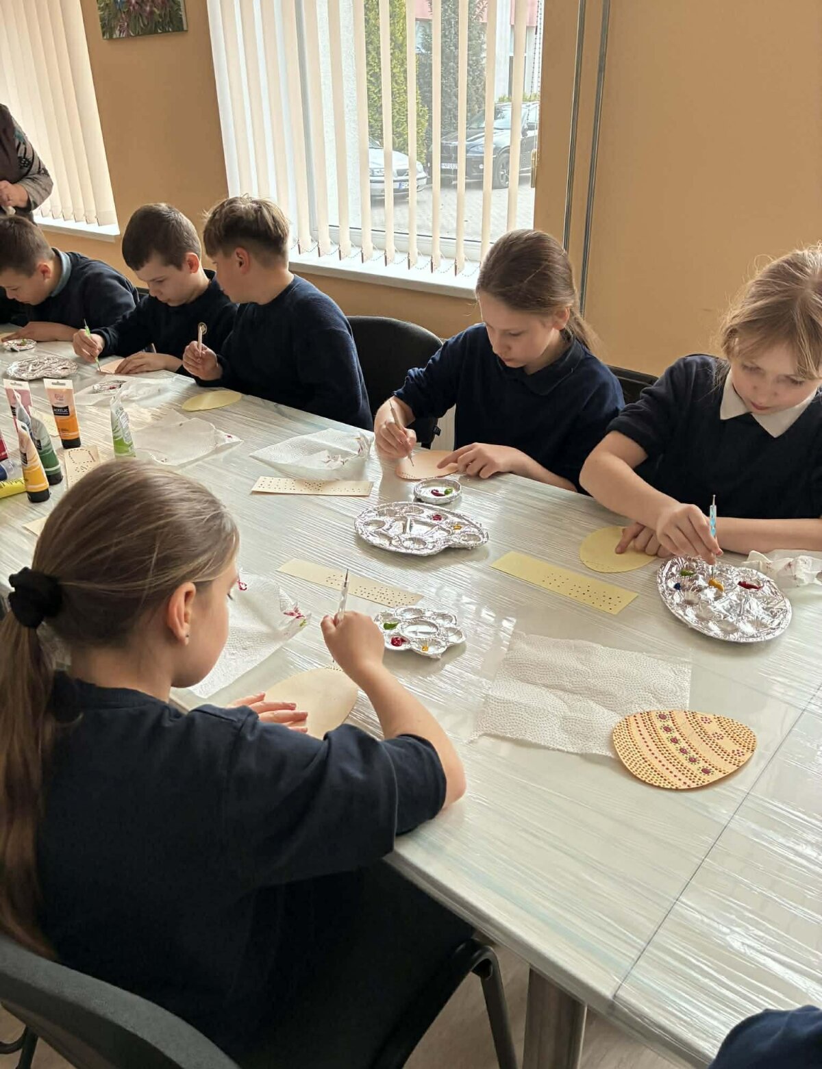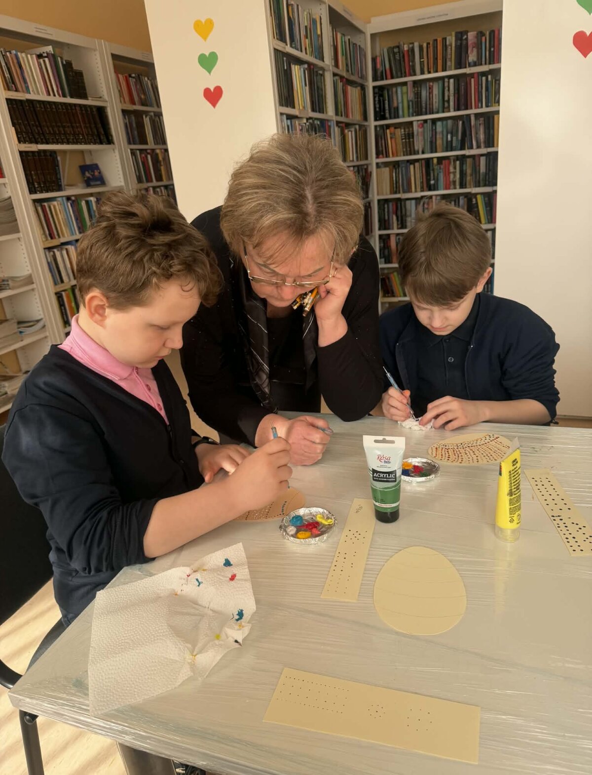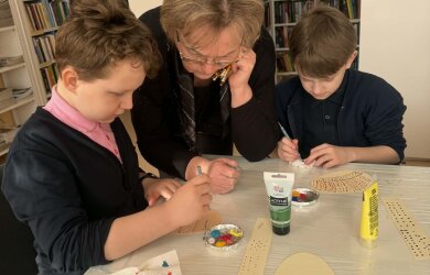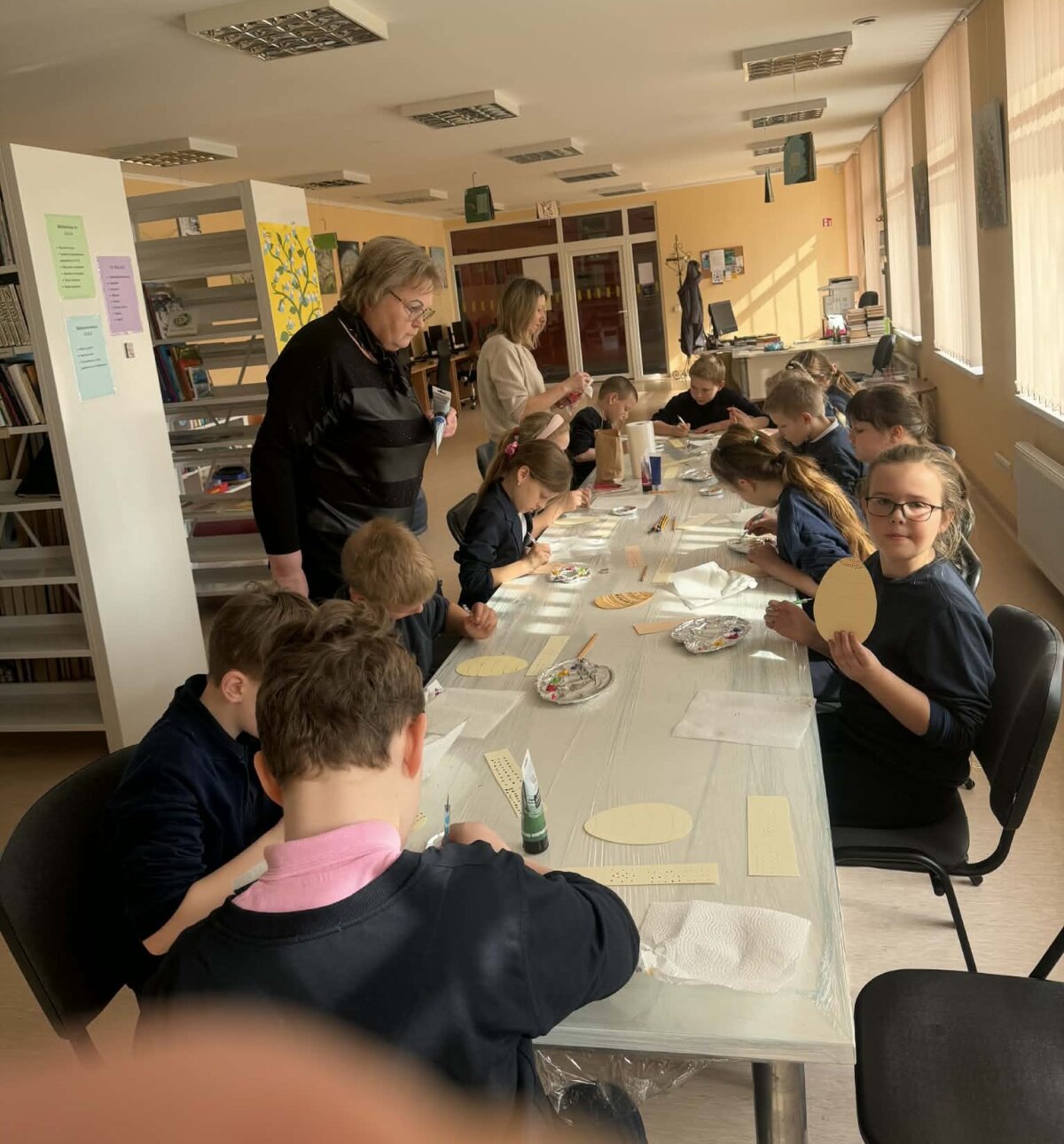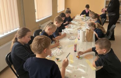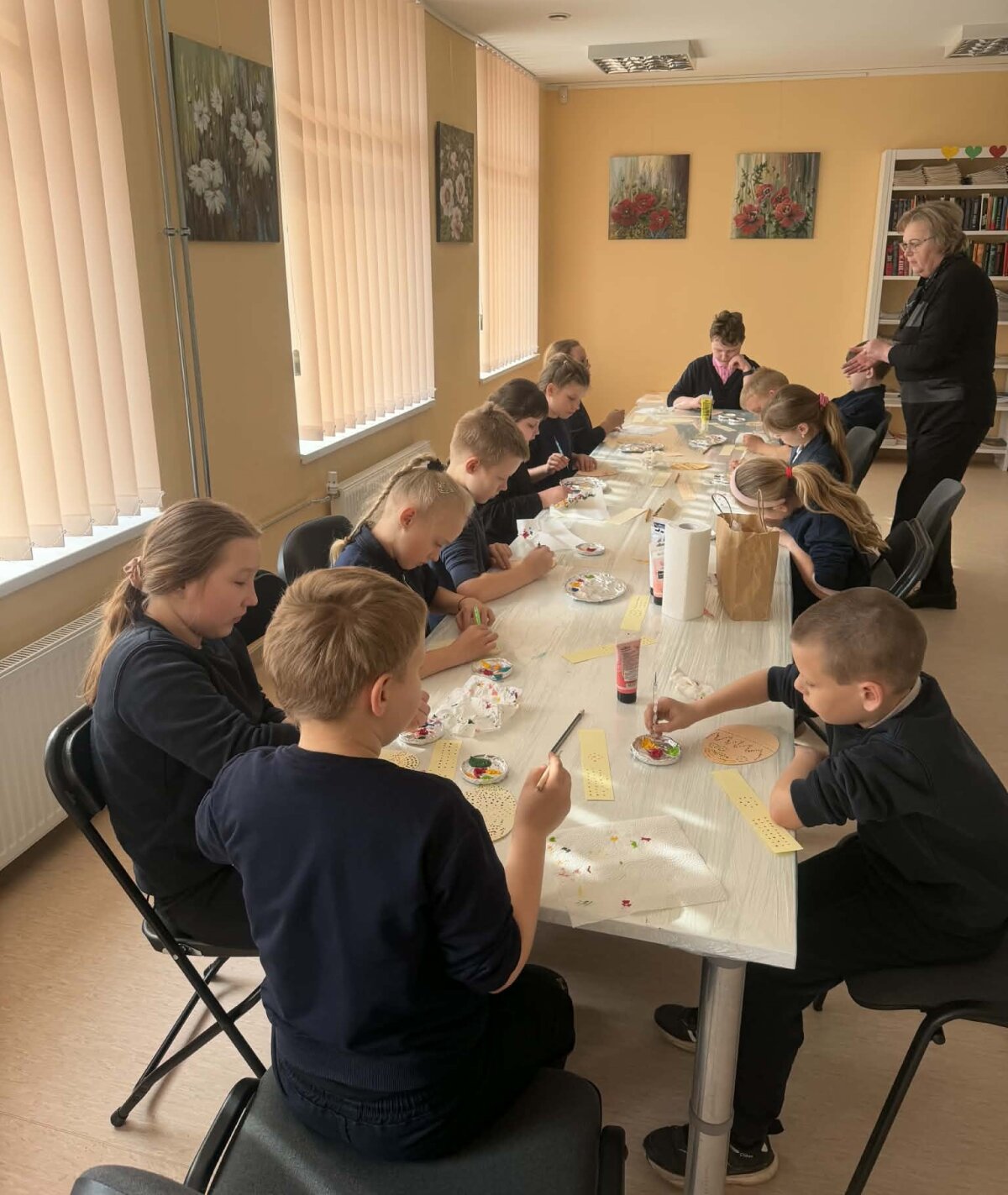 Juos čia pakvietė M. Daukšos bibliotekos Josvainių skyriaus bibliotekininkė Kristina Masiliūnienė. Su taškavimo technika vaikus supažindino Labūnavos bibliotekininkė Elvyra Skeivienė. Naudodami akrilinius dažus, trečiokai pasinėrė į taškelių pasaulį. Užsiėmimo metu jie ne tik pasigamino dailius popierinius margučius, bet ir atsipalaidavo, nusiramino.