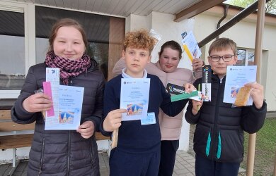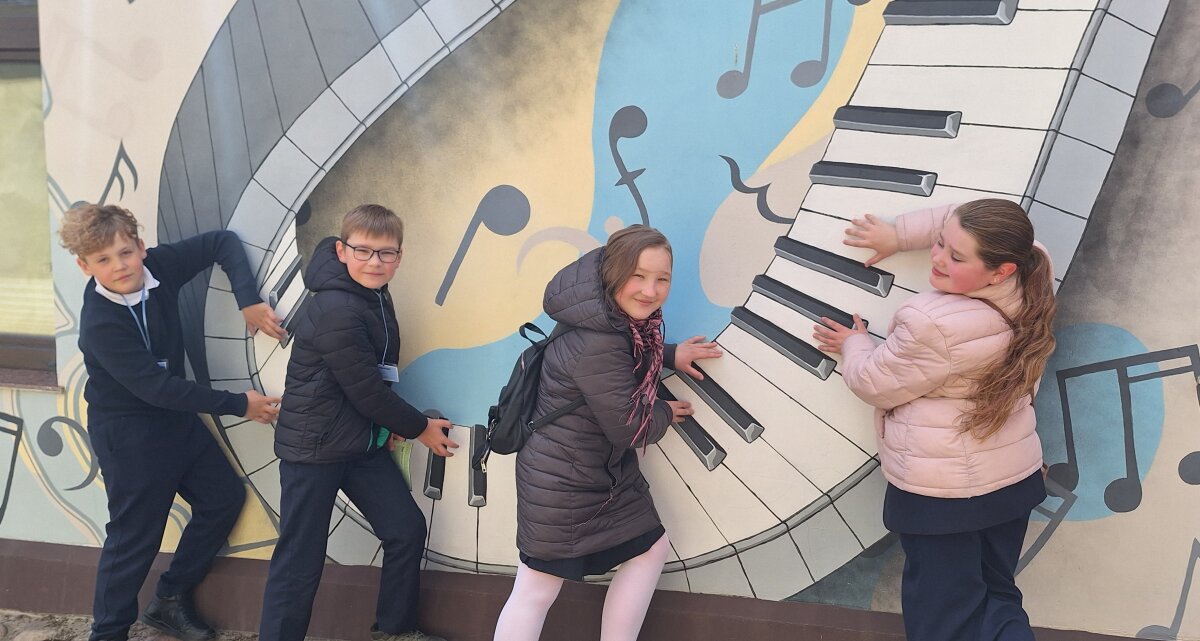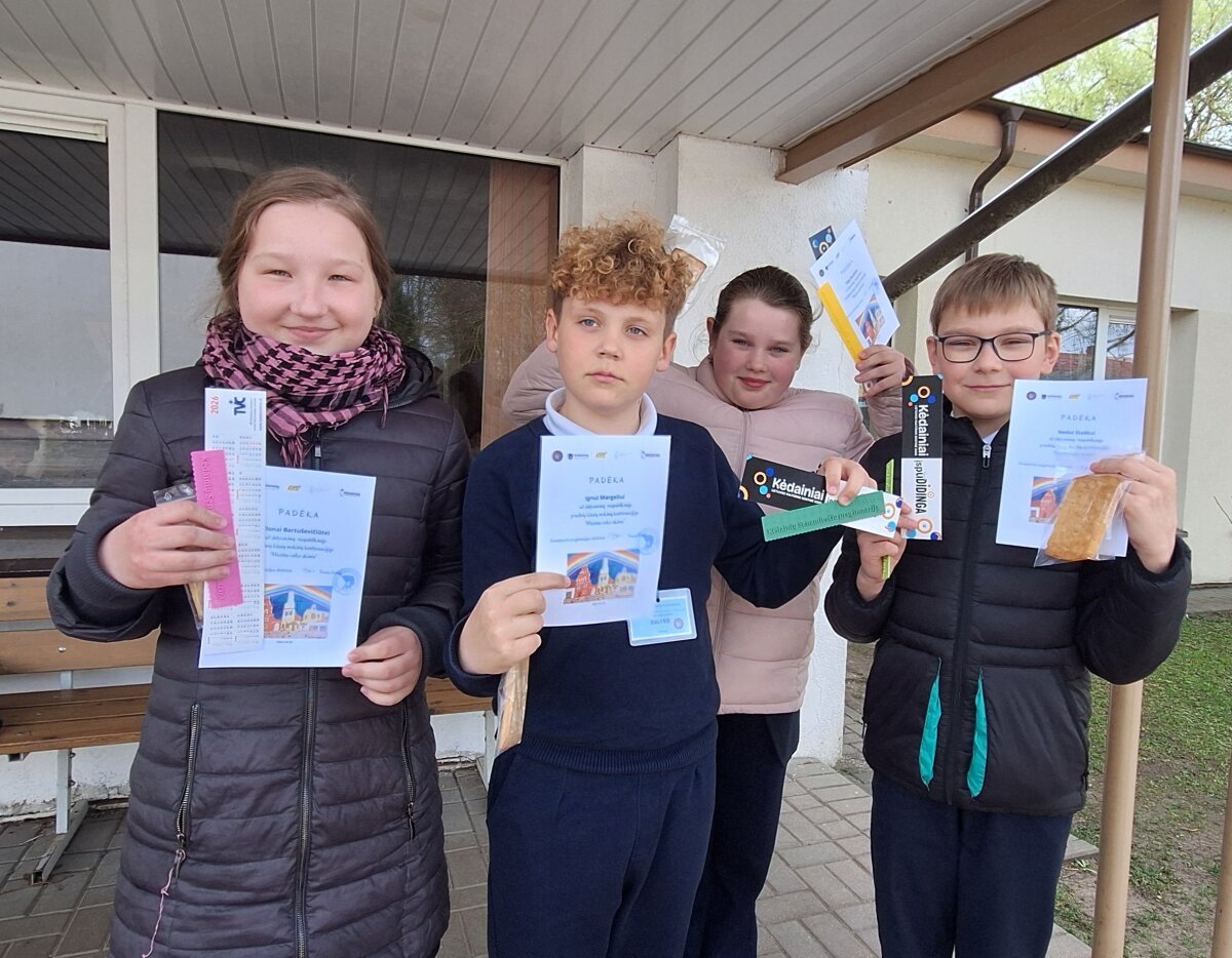 Mūsų mokyklos dalyviai : 3a Ignas M., 3b Elona B., 4a Nedas S., 4b Tėja B. ir mokytoja Kristina Norkūnienė.