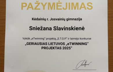 Spalio 8 dieną anglų kalbos mokytoja Sniežana Slavinskienė dalyvavo iškilmingoje „eTwinning“ ir Europos inovatyvaus mokymo apdovanojimų šventėje, vykusioje Vilniuje. Renginio metu mokytojai buvo įteiktas Nacionalinis „eTwinning“ Kokybės ženklelis už puikiai įgyvendintą tarptautinį projektą „S.T.O.P“, kuris laimėjo konkursą ir buvo pripažintas geriausiu Lietuvos „eTwinning“ projektu 2025 metais!